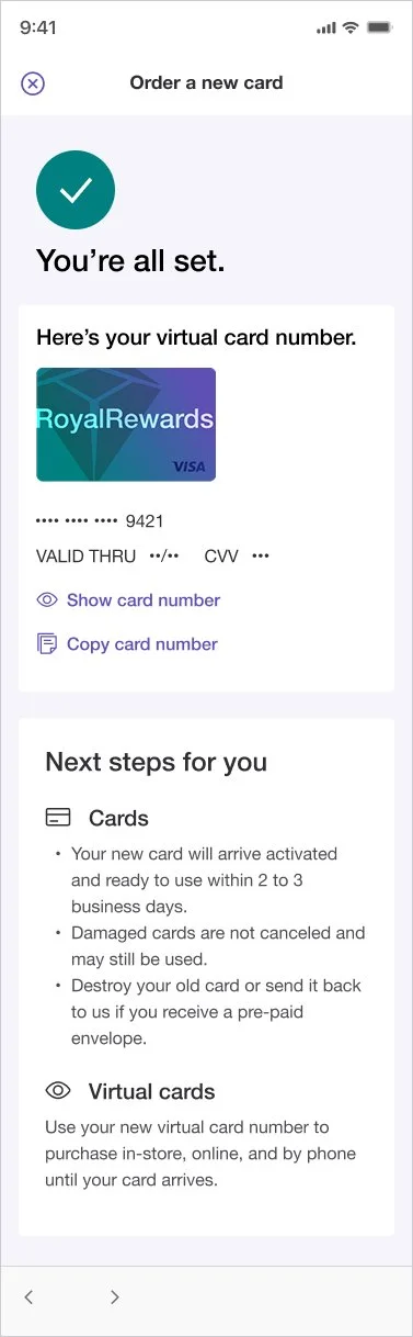 Created a multi-digital card experience for customers when they receive their new card number to meet A11Y requirements